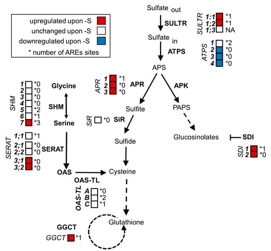 Plants regulate the transcription of genes involved in sulfate assimilation and glucosinolate biosynthesis in response to sulfur supply. When plants are exposed to sulfur limitation, they upregulate the expression of genes involved in sulfate uptake and assimilation. Simultaneously, the expression of genes implicated in the synthesis of sulfur-containing secondary metabolites is downregulated to prioritize sulfate usage for primary metabolites. In this scheme of plant sulfate metabolism, the transcript levels of genes (italics) encoding for enzymes mediating sulfate assimilation (bold) are indicated by a color code. Red and blue represent significant (p < 0.05; ≥2-fold) up- and downregulations under sulfur limitation. White represents no significant change in comparison to full nutrient supply. Many sulfur responsive transcripts harbor AU-rich signal elements (AREs) in their 3′ untranslated regions (UTRs). The number of AREs found in each 3′UTR is indicated next to the asterisk. (Transcript data from []).