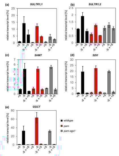 AtPARN is not required for the degradation of sulfur starvation-induced transcripts upon the resupply of the macronutrient. Relative transcript levels of SULTR1;1 (a), SULTR1;2 (b), SHM7 (c), SDI1 (d) and GGCT (e) upon regular sulfur supply (+S, 500 μM), starvation (-S, two weeks at 0 μM) and recovery (-S → +S, 3 h at 500 μM) in roots of parn (red), parn-ags1 (grey) and wildtype plants (black). Results were normalized to the expression values measured for wildtype plants under full nutrient supply. Bars represent standard errors (n = 3).