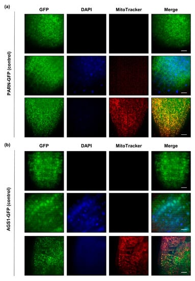 According to translational fusions with GFP, PARN localizes to p-bodies when it is transiently expressed under the control of the 35S promoter in tobacco leaves []. This finding is discussed controversially in the literature, since it contradicts earlier PARN localization studies in onion epidermal peels, reporting a nuclear–cytoplasmic localization [,]. Both observations do however agree with the predominantly nuclear–cytosolic localization of PARN reported for metazoans. When AtPARN-GFP expression is driven by the native PARN promoter, the fusion protein localizes to the mitochondria, indicating a unique function of PARN in higher plants [,].