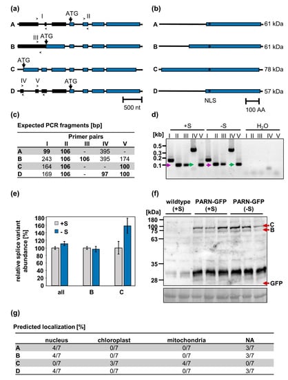 One possible explanation for the dual localization of PARN observed in our experiments is the existence of alternative PARN splice isoforms encoding for different protein variants confined to distinct cellular compartments. The Arabidopsis Information Resource (TAIR) provides sequences of four AtPARN splice variants, A–D (Figure 4a). Since the splice variants A and D give rise to the same protein, the four splice variants encode for three distinct protein species. These species differ only in the length of their N-terminus (Figure 4b). Since the N-terminus is an important determinant of subcellular protein localization, the localization of the isoforms A–D was predicted by seven algorithms. While the splice variants A and B were predicted to localize to the nucleus or the cytoplasm (denoted as “N.A.”), splice variant C was predicted to be confined to the mitochondria or the chloroplasts (Figure 4g).