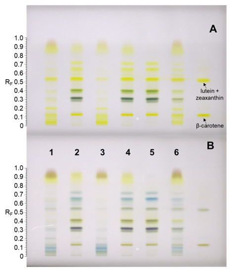 - Rodić, Z.; Simonovska, B.; Albreht, A.; Vovk, I. Determination of lutein by high-performance thin-layer chromatography using densitometry and screening of major dietary carotenoids in food supplements. J. Chromatogr. A 2012, 1231, 59–65. [Google Scholar] [CrossRef]