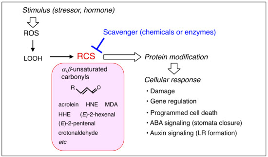 RCS can form covalent bonds with proteins to change their functions, and thereby exert various biological effects [20,21,22,23]. This property is suitable for a signal mediator that transmits ROS stimulus to target proteins. It has been known that RCS, when added exogenously to cells, evoke various physiological responses, from gene induction to cell death, both in animals [18] and plants (summarized below). Recent studies combining carbonyl analysis, use of chemical or enzymatic RCS scavengers and observation of plant responses to ROS have revealed that RCS are generated downstream of ROS stimuli and mediate the oxidative signal to the cell (Figure 1). We provide an overview of current research status of RCS in plant physiology. First, we will briefly summarize their production in plants (Section 2). Next, we will summarize the potential actions of RCS from protein modification to toxicity and signaling, by seeing the effects of exogenously added RCS on plants (Section 3) and then examine the physiological roles of the endogenously produced RCS (Section 4). Recent findings of the involvement of RCS in the signaling of plant hormones, i.e., abscisic acid (ABA) and auxin, will be introduced. Last, the regulation of RCS with scavenging enzymes is discussed (Section 5).