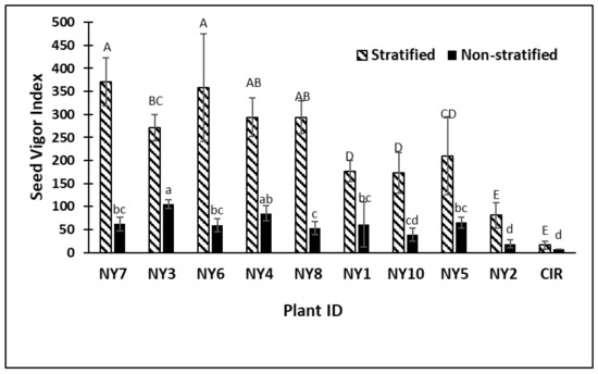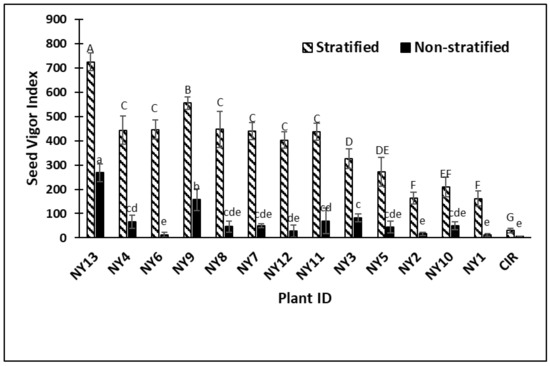 Experiment 1, spring 2017 results showing seed vigor index of switchgrass genotypes and the CIR check in stratified and non-stratified germination assays. Capitalized letters represent significant differences among Plant ID genotypes after seed stratification, while lower case letters represent significant differences for non-stratified Plant ID genotypes. Plant IDs with the same letter are not significantly different. Errors bars are standard deviation of means of four replications per Plant ID. P < 0.0001 value for both stratified and non-stratified germination with LSD values of 83.3 and 31.9 respectively.