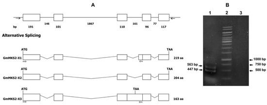 The sequence of the transcript variant X1 (660 bp) is identical to that of the transcript variant X2, except for the insertion of 45 intronic nucleotides between exon 3 and exon 4. To check the existence of transcript variant X1, RT-PCR was performed using the forward primer located at the beginning of the transcript and the reverse primer positioned within the 45-nucleotide insertion region. Analysis of the DNA fragments produced in this experiment by agarose gel electrophoresis gave two sharp bands: one below 500 bp, and the other above 500 bp (Figure 1B). As expected from its size, subsequent sequencing analysis showed that the sequence of the smaller product was 100% identical to the first 447-nucleotide-long sequence of the transcript variant X1. This variant, designated as GmMKS2-X1, is produced by using an alternative 3′ acceptor site located in the middle of intron 3, leading to mis-splicing of the latter part of the intron. Sequencing of the amplicon larger than 500 bp revealed an additional transcript variant (designated as GmMKS2-X3) that has not yet been curated in the RefSeq database. Next, we optimized cDNA amount, annealing temperature, cycling time, and annealing/extension time of RT-PCR reactions in order to obtain as many transcript variants of GmMKS2 as possible. As a result, two alternative splicing forms, GmMKS2-X1 and GmMKS2-X3, were simultaneously amplified with the same set of primers for the amplification of the full-length GmMKS2-X2 (Supplementary File 2). As described above, the GmMKS2-X1 variant contains an in-frame insertion of 45 intronic nucleotides that gives rise to a longer GmMKS2 isoform with 15 extra amino acids compared to the GmMKS2-X2 isoform. In the GmMKS2-X3 variant, the entire intron 3 was retained, leading to a premature stop codon within the third exon. This variant was therefore predicted to encode a protein that is shorter by 41 amino acid residues (Supplementary File 3).