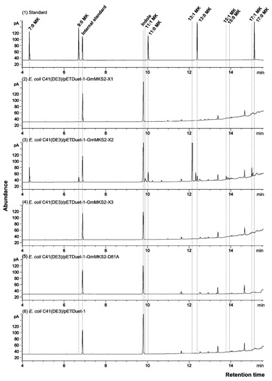 The compounds 3-ketoacids are inherently unstable and decarboxylate spontaneously, particularly when heat is applied, to give 2-methylketones with an odd number of carbons [9,20]. Gas chromatography–mass spectrometry (GC–MS) analysis of the culture of E. coli C41 (DE3) expressing GmMKS2-X1, -X2, and -X3 after heat-activated decarboxylation was used to identify the production of 3-ketoacids. This analysis identified the presence of odd-chain 2-methylketones including 7:0, 9:0, 11:1, 11:0, 13:1, 13:0, 15:1, 15:0, and 17:1 methylketones, with 2-tridecenone (13:1) being the most abundant (6022.97 ± 105.14 ng/OD unit) in E. coli cells expressing GmMKS2-X2 (Table 1). The compounds were either absent or undetectable in the culture of E. coli C41 (DE3) expressing GmMKS2-X1 or GmMKS2-X3 or carrying an empty plasmid pETDuet-1 (Figure 2). These results suggest that the corresponding 3-ketoacids ranging from C8 to C18, which were converted to methylketones for GC–MS analysis, were present in the culture of E. coli C41 (DE3) expressing GmMKS2-X2. Previous studies demonstrated that extractions without heat-activated decarboxylation reduced the level of all methylketone types significantly, regardless of their carbon chain length [9].