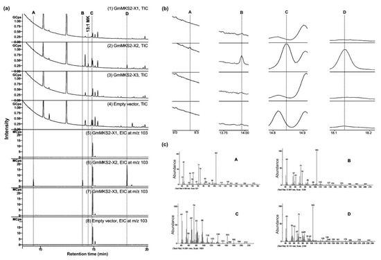 Analysis by GC of methyl esters obtained from fatty acids secreted into the culture by E. coli C41(DE3) cells carrying an empty vector or expressing GmMKS2-X1, GmMKS2-X2, or GmMKS2-X3. (a) Representative total ion chromatogram (TIC, 1–4) and extracted ion chromatogram at m/z 103 (EIC at m/z 103, 5–8) of GC–MS analysis for the detection of methyl ester derivatives of 3-hydroxy fatty acids; (b) Enlarged image of the labeled peaks; (c) Mass spectra of the labeled peaks. The peaks were identified by MS. A: β-hydroxyoctanoic acid (β-OH 8:0 FA), B: 3-hydroxydecanoic acid (β-OH 10:0 FA), C: methyl cis-Δ5-dodecenoate, and D: β-hydroxydodecanoic acid (β-OH 12:0 FA). Cells were grown, and cultures were collected and treated as described in “Materials and Methods”.