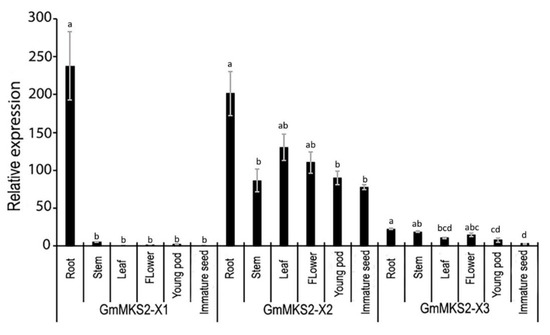 The levels of each of the three identified transcripts (GmMKS2-X1, GmMKS2-X2, and GmMKS2-X3) in different tissues of soybean were measured by qRT-PCR (Figure 4). GmMKS2-X1 was primarily expressed in the roots; GmMKS2-X2 expression was the highest in the roots and compared to all other tissues examined. GmMKS2-X3 was also found in all tissues of seven-week-old plants, but at very low levels compared with GmMKS2-X2 (Figure 4).