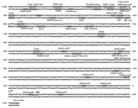 - Higo, K.; Ugawa, Y.; Iwamoto, M.; Korenaga, T. Plant cis-acting regulatory DNA elements (PLACE) database: 1999. Nucl. Acids Res. 1999, 27, 297–300. [Google Scholar] [CrossRef] [PubMed]