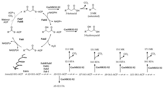 GmMKS2-X2 acts on a broad range of acyl-ACPs, intermediates in fatty acid biosynthesis in E. coli. Unsaturated fatty acid biosynthesis in E. coli begins with the isomerization of trans-2-decenoyl-ACP to cis-3-decenoyl-ACP by FabA. This intermediate is then condensed with malonyl-ACP by FabB instead of being reduced. The resulting unsaturated β-ketoacyl-ACP is processed similar to its saturated counterpart, until unsaturated C16 and C18 acyl-ACPs are made and incorporated into phospholipids. The compounds 2-methylketone, 3-keto fatty acid, and fatty acid are denoted as MK, KFA, and FA, respectively. The arrows between each intermediate denote, in order, 3-ketoacyl-ACP synthase (FabB or FabF), 3-ketoacyl-ACP reductase (FabG), 3-hydroxyacyl-ACP dehydratase (FabZ), and enoyl-ACP reductase (FabI).