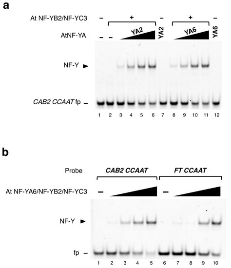 AtNF-YAs functionally trimerize with At NF-YB2/NF-YC3 in electrophoretic mobility shift assay (EMSA). EMSAs were performed to assess AtNF-Y trimerization and DNA binding: (a) At NF-YA2 or NF-YA6 subunits were incubated at increasing concentrations (60, 120, 180, 240 nM) with the CAB2 CCAAT probe (20 nM) in presence of the At NF-YB2/NF-YC3 histone fold domain (HFD) dimer (30 nM). As negative controls, AtNF-YAs (lanes 7, 12; 240 nM) or the HFD dimer (lane 2; 30 nM) were incubated alone with the probe; (b) AtNF-Y trimer composed of At NF-YB2/NF-YC3 HFD dimer and AtNF-YA6 (1:4.5 fixed molar ratio) was used in binding reactions at increasing concentrations (40, 50, 60, 70 nM) with CAB2 promoter (−65 bp) or FT enhancer (−5.3 kb) CCAAT oligonucleotide probes (20 nM). Lanes 1, 6: Probe alone. Below, the 31mers CCAAT oligonucleotides’ sequences used in EMSA. The CCAAT pentamer is highlighted in boldface. Underlined bases were mutagenized in competitor oligos used in EMSA competition analyses shown in Figure 2a,b. (a,b) On the left side of each gel, an arrowhead indicates the AtNF-Y/DNA complex; fp: Free probe; purified recombinant proteins are shown in Figure S1.