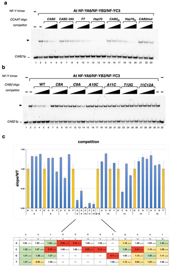 Next, we assessed the sequence-specificity of the At NF-YA6/NF-YB2/NF-YC3 trimer for DNA. Considering the higher avidity observed for the CAB2 CCAAT site as compared to the FT distal element, to obtain maximum sensitivity of the assays, we decided to use the CAB2 promoter element for measurements of plant NF-Y DNA selectivity. First, the specificity of the CAB2 complex was verified by challenging with unlabeled CCAAT oligos of different lengths and origins: The WT CAB2 (−65 bp from transcription start site (TSS)), a second CCAAT element found in the CAB2 promoter (−245 bp), the FT CCAAT distal element, as well as the high affinity—for mammalian NF-Y—HSP70 CCAAT (Oligonucleotide sequences are listed in Table S1). We also tested 25 bp competitors designed on the crystallized human HSP70 CCAAT oligo and on the CAB2 CCAAT. Figure 2a shows that, bar CAB2 −245, all compete efficiently, although, as expected from dose response EMSAs, the FT CCAAT shows lower competition rates (i.e., less affinity) than the WT CAB2; the human HSP70 CCAAT competes extremely well. The shorter versions of the CAB2 −65 and of the HSP70 oligos compete with decreased efficiency. The competition was substantially decreased by a single mutation in the CCAAT pentamer (CAB2mut, ACAAT, see C8A oligo in panel (b)). We further analyzed the specificity of the plant NF-Y trimer—based on AtNF-YA6—for CCAAT by challenging it with CAB2 oligo competitors containing single mutations in the pentanucleotide: Figure 2b,c shows that transversions in any of the five central base-pairs lead to a sharp decrease in affinity. Similar results were obtained with the AtNF-YA2 based trimer (data not shown). In conclusion, the plant NF-Y complexes containing the NF-YA, NF-YB and NF-YC subunits used here are bona fide CCAAT-binding entities.