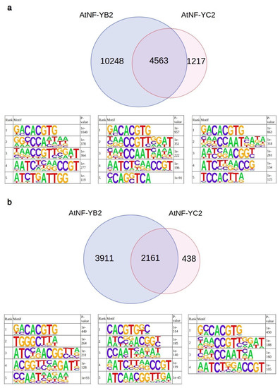 Analysis of AtNF-YB2 and AtNF-YC2 binding sites in vivo. Venn diagram displaying the number of peaks detected in the AtNF-YB2, AtNF-YC2 ChIP-Seq experiments and the number of shared peaks [31] with enriched motifs, as recovered by Homer (p-value ≤ 10e−30) for AtNF-YB2 (left), AtNF-YC2 peaks (right) and shared peaks (center). (a) All Peaks. (b) Peaks in promoter regions (defined as genomic intervals from −500 bp to an annotated TSS).