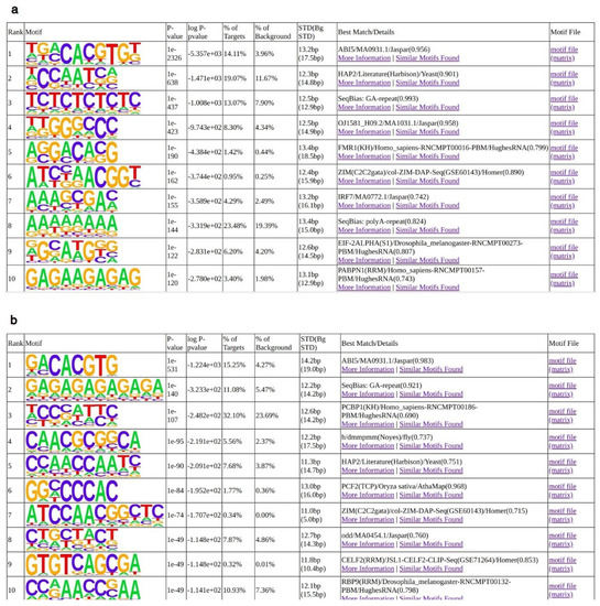 Analysis of LEC1 binding sites in vivo. Enriched motifs, as recovered by Homer (p-value ≤ 10e−30) for soybean LEC1 peaks [33]. (a) All Peaks. (b) Peaks in promoter regions (defined as genomic intervals from −500 bp to an annotated TSS).
