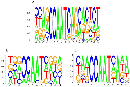 Remarkably, all our analyses recovered significant enrichment of CCAAT-like motifs, showing a generally purine-rich flanking context, with a notable enrichment—particularly A—at positions +2 and +4 (Matrices no. 5, 3, 2 in the left, central, right panels, respectively, in Figure 3a; Matrices no. 5, 3, 3 in the left, central, right panels in Figure 3b). This is consistent with the results of our EMSAs. In accordance with the analyses by Song et al. [31], several other motifs were more frequently observed and more significantly enriched than the canonical CCAAT box. In particular, ABRE-like, G box containing elements (C[A/C]CACGTG) and TCP responsive element-like motifs (GCCCA). This observation mirrors a previous analysis of promoters of genes differentially expressed in light stressed co, nf-yb2 nf-yb3, and nf-yc3 nf-yc4 nf-yc9 mutants, where a CORE-like site, as well as a G box variant (CCACGTG), but not the CCAAT motif were recovered [18].