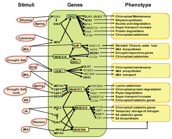 Moreover, some studies have revealed that the regulating networks governing leaf senescence maintain a crosstalk between activating stimuli from different phytohormones making this process even more complex [54]. For example, EIN2 is also upregulated by abscisic acid (ABA) or salt [55,56,57,58].