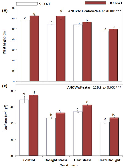 Effect of drought, heat, and interaction between drought and heat stress on (A) plant height (cm) and (B) leaf area (cm2 g−1) of A. sieberi alba. Data expressed as mean of triplicates, error bars represent standard error for means. Means marked with different letters are significantly different according to ANOVA and Duncan’s multiple range comparisons (DMRTs) at p < 0.05.