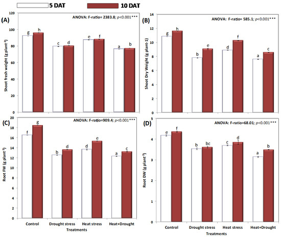 Effect of drought, heat, and interaction between drought and heat stresses on (A) shoot fresh weight (g-FW plant−1), (B) shoot dry weight (g-DW plant−1), (C) root fresh weight (g-FW plant−1), and (D) root dry weight (g-DW plant−1) of A. sieberi alba. Data expressed as mean of triplicates, error bars represent standard error for means. Means marked with different letters are significantly different according to ANOVA and DMRTs at p < 0.05.