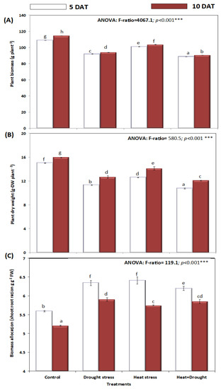 Effect of drought, heat, and interaction between drought and heat stresses on (A) plant biomass (g-FW plant−1), (B) plant dry weight (g DW plant−1), (C) biomass allocation (shoot-root ratio, g g−1 FW) of A. sieberi alba. Data expressed as mean of triplicates, error bars represent standard error for means. Means marked with different letters are significantly different according to ANOVA and DMRTs at p < 0.05.