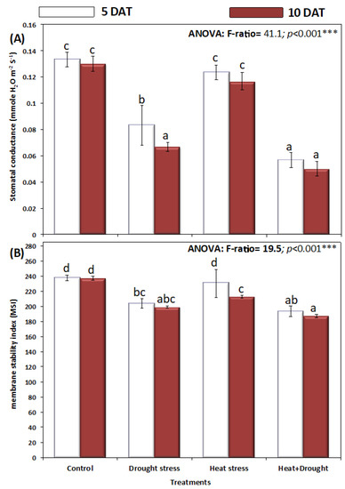 Negative effects of drought and heat stress may have considerably contributed to reduce photosynthetic functioning reflecting on the altered physiological process and plant metabolism [62]. Further drought and heat stress declined chlorophyll concentration probably due to disturbances in chloroplast structural integrity, uptake of magnesium [57], and increased chlorophyll denaturation [63,64,65,66]. Increased stomatal conductivity during heat stress is considered to be an adaptive mechanism to improve transpiration for allowing cooling, as have been reported in wheat [67]. In this study, stomatal conductance in heat stressed plants was comparable with the controls, reflecting the reduction in stomatal conductance maximally due to the drought stress mediated declined leaf water potential [68,69] and the decline is highly intensified after the stress period prolonged from five to ten days.