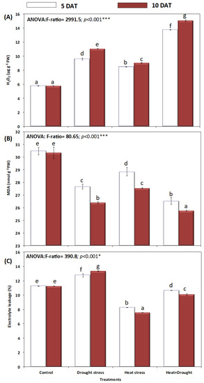 Effect of drought, heat, and interaction between drought and heat stresses on oxidative damage (A) cellular hydrogen peroxide level (H2O2), (B) lipid peroxidation (MDA), and (C) electrolyte leakage (%) (EL) of A. sieberi alba. Data expressed as mean of triplicates, error bars represent standard error for means. Means marked with different letters are significantly different according to ANOVA and DMRTs at p < 0.05.