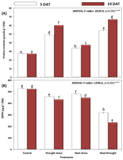 The DPPH radical scavenging activity of different treatments in A. sieberi alba leaves revealed a decrease (Figure 10B). The combined effect of heat and drought induced a decline of 40% in DPPH radical scavenging activity, with a more pronounced effect after ten days of stress treatments (Figure 9B).