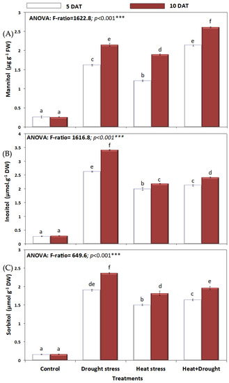 Effect of drought, heat, and interaction between drought and heat stresses on (A) mannitol (µg g−1FW), (B) inositol (µmol. g−1FW), and (C) sorbitol (µmol. g−1FW) of A. sieberi alba. Data expressed as mean of triplicates, error bars represent standard error for means. Means marked with different letters are significantly different according to ANOVA and DMRTs at p < 0.05.