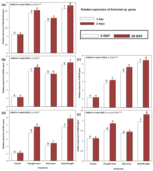 Relative gene expression of A. sieberi alba. Under the effect of drought, heat, and interaction between drought and heat stresses on (A) aquaporin gene, (B) DHN-1 gene, (C) HSP-70 gene, (D) LEA-1 gene, and (E) OSM-34 genes. Data expressed as mean of triplicates, error bars represent standard error for means. Means marked with different letters are significantly different according to ANOVA and DMRTs at p < 0.05.