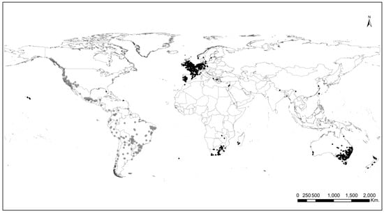 Global geographic distribution of Azolla filiculoides. Grey dots represent native occurrence localities and black dots represent invaded occurrence localities.