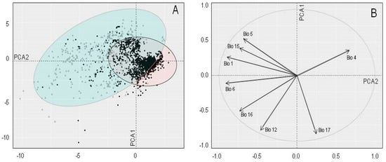 (A) The principal component analysis (PCA) for two Azolla filiculoides ranges. Grey triangles represent native localities and black dots represent invasive localities in the environmental space. Ellipse level 0.95. (B) Bioclimatic variables in the environmental space defined by the first two principal component axes. PCA1 and PCA2 explained 48.8% and 31% of the variation in the data, respectively. Annual mean temperature (Bio 1), temperature seasonality (Bio 4), maximum temperature of the warmest month (Bio 5), minimum temperature of the coldest month (Bio 6), annual precipitation (Bio 12), precipitation seasonality (Bio 15), precipitation of the wettest quarter (Bio 16), and precipitation of the driest quarter (Bio 17).