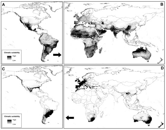 Current potential distribution of Azolla filiculoides based on reciprocal models. (A) Model calibrated with native occurrences and (B) model projected onto the invasive range. (C) Model projected onto the native range and (D) model calibrated with invasive occurrences. Darker shades indicate higher environmental suitability. Arrows indicate the direction of model projections.