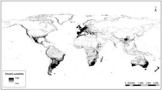 In recent years, species distribution models (SDMs) have become more frequently used in the management and control of non-native species [,,]. SDM techniques allow correlating species occurrence records with environmental variables to uncover the potential distribution of a species and, thus, to find the most suitable areas for the species survival [,]. For this reason, SDMs have been used in some studies to analyze whether there is niche conservatism or niche shift between native and invaded distribution ranges, the results of which were used to design appropriate management strategies [,].