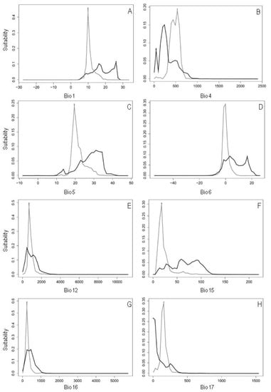 Predicted niche occupancy (PNO) profiles. The vertical axes show the total suitability of the bioclimatic variable and the horizontal axes show the bioclimatic variable for each range over its geographic distribution. The overlapping zones indicate similar climatic tolerances, and the amplitude of the profile indicates the specificity of climatic tolerance. Black lines represent the native range of Azolla filiculoides, and grey lines the invasive range of Azolla filiculoides. (A) Annual mean temperature (Bio 1), (B) temperature seasonality (Bio 4), (C) maximum temperature of the warmest month (Bio 5), (D) minimum temperature of the coldest month (Bio 6), (E) annual precipitation (Bio 12), (F) precipitation seasonality (Bio 15), (G) precipitation of the wettest quarter (Bio 16), and (H) precipitation of the driest quarter (Bio 17).