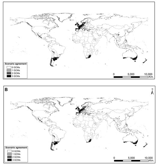 The future potential distribution of A. filiculoides was projected for two future emission scenarios, one optimistic and the other pessimistic, using the representative concentration pathways (RCPs: 4.5 and 8.5, respectively) [], and for two time periods (2050 and 2080) using three global circulation models (GCMs): CSIRO MK 3_6_0, MIROC MIROC 5 and MOHC HADGEM 2 ES. The use of three GCMs accounts for the uncertainty associated with such models []. These data were obtained from the CGIAR Research Program on Climate Change, Agriculture and Food Security (http://www.ccafs-climate.org).