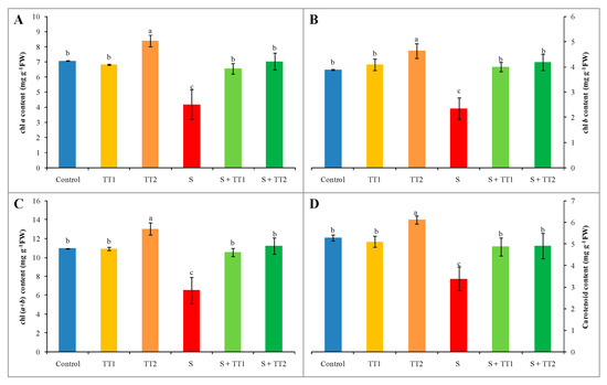 Effect of TEB and TRI on photosynthetic pigment contents: chl a (A), chl b (B), chl (a+b) (C), and carotenoid (D) in leaf of 50–day-old cucumber plants under salt stress for six days. In this case, TT1, TT2, and S indicate 1.375 µM TEB+0.5 µM TRI, 2.75 µM TEB+1.0 µM TRI, and 60 mM NaCl, respectively. Means (±SD) were calculated from three replicates for each treatment. Bars with different letters are significantly different at p ≤ 0.05 by applying the Fisher’s LSD test.