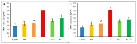 Effect of TEB and TRI on MDA and ROS production, MDA content (A), and H2O2 content (B) in leaves of 50–day-old cucumber plants under salt stress for 6 days. In this case, TT1, TT2, and S indicate 1.375 µM TEB+0.5 µM TRI, 2.75 µM TEB+1.0 µM TRI, and 60 mM NaCl, respectively. Means (±SD) were calculated from three replicates for each treatment. Bars with different letters are significantly different at P ≤ 0.05 by applying the Fisher’s LSD test.