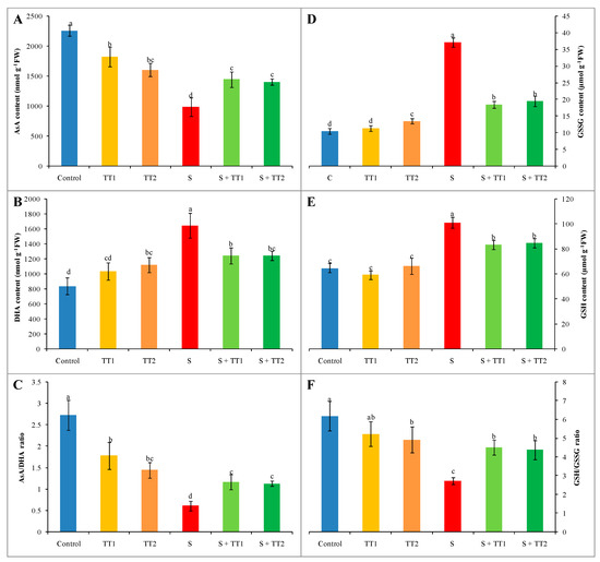 Effect of TEB and TRI on the non-enzymatic antioxidant. AsA content (A), DHA content (B), AsA/DHA ratio (C), GSSG content (D), GSH content (E), and GSH/GSSG ratio (F) in leaf of 50–day-old cucumber plants under salt stress for six days. Here, TT1, TT2, and S indicate 1.375 µM TEB+0.5 µM TRI, 2.75 µM TEB+1.0 µM TRI and 60 mM NaCl, respectively. Means (±SD) were calculated from three replicates for each treatment. Bars with different letters are significantly different at p ≤ 0.05 when applying the Fisher’s LSD test.