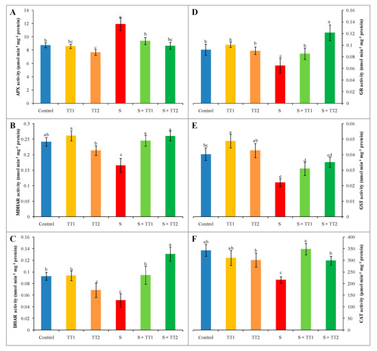 Effect of TEB and TRI on AsA-GSH pathway enzymes. APX (A), MDHAR (B), DHAR (C), GR (D), GST (E), and CAT (F) activity in leaf of 50–day-old cucumber plants under salt stress for six days. Here, TT1, TT2, and S indicate 1.375 µM TEB+0.5 µM TRI, 2.75 µM TEB+1.0 µM TRI, and 60 mM NaCl, respectively. Means (±SD) were calculated from three replicates for each treatment. Bars with different letters are significantly different at p ≤ 0.05 by applying the Fisher’s LSD test.