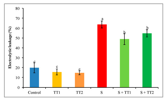 Effect of TEB and TRI on electrolytic leakage in leaves of 50–day-old cucumber plants under salt stress for six days. Here, TT1, TT2, and S indicate 1.375 µM TEB+0.5 µM TRI, 2.75 µM TEB+1.0 µM TRI, and 60 mM NaCl, respectively. Means (±SD) were calculated from three replicates for each treatment. Bars with different letters are significantly different at p ≤ 0.05 when applying the Fisher’s LSD test.