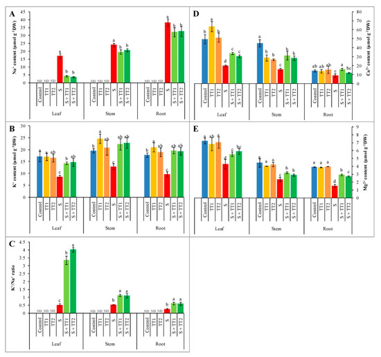 Effect of TEB and TRI on ion homeostasis. Na+ contents (A), K+ contents (B), K+/Na+ ratio (C), Ca2+ content (D), and Mg2+ content (E) in the leaf, stem, and root of 50–day-old cucumber plants under salt stress for six days. Here, TT1, TT2, and S indicate 1.375 µM TEB+0.5 µM TRI, 2.75 µM TEB+1.0 µM TRI, and 60 mM NaCl, respectively. Means (±SD) were calculated from three replicates for each treatment. Bars with different letters are significantly different at p ≤ 0.05 when applying the Fisher’s LSD test.