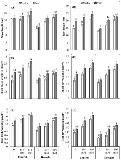 Drought stress (60% field capacity) was found to significantly (p ≤ 0.001) reduce the shoot and root length as well as their fresh and dry weights in both maize cultivars, compared with the control. Exogenous application of both Si levels (4 and 6 mM) significantly (p ≤ 0.01) mitigated the detrimental effects of drought stress in all growth attributes of both maize cultivars. Nevertheless, such positive effects were more prominent for 6 mM Si. Averaged across two cultivars, 6 mM Si increased the shoot length of maize by 22.95% and 53.70%, root length by 34.72% and 69.42%, shoot dry weight by 57.61% and 83.07%, and root dry weight by 86.66% and 88.35% under control and drought stress conditions, respectively, compared with no Si application. The cv. Pearl performed better than cv. Malka regarding all growth parameters (Figure 1; Table 1).
