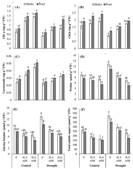Glycine betaine and total soluble sugars were significantly (p ≤ 0.001) increased in both cultivars under drought stress. However, Si priming was found to significantly (p ≤ 0.001) decrease the accumulation of glycine betaine and total soluble sugars in stressed and non-stressed plants (Figure 2E,F; Table 1). Silicon at 6 mM recorded a greater decrease in these attributes than 4 mM. Cultivar difference was also evident, cv. Malka showed higher accumulation of glycine betaine and total soluble sugars in all osmoprotectants (Figure 2; Table 1).