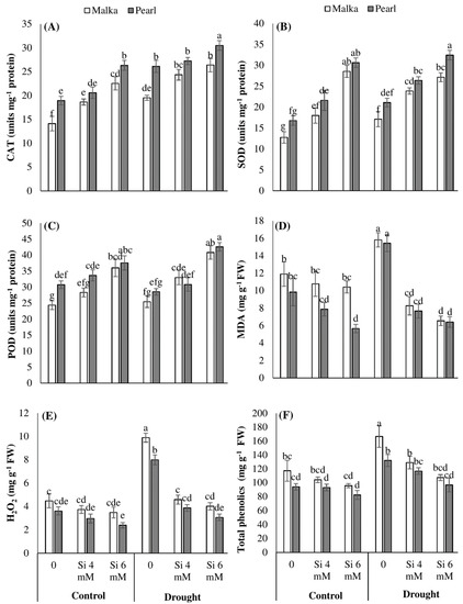 Effects of seed priming with silicon on (A) catalase, (B) superoxide dismutase, (C) peroxidase, (D) malondialdehyde, (E) hydrogen peroxide, and (F) total phenolics content in two maize cultivars under drought stress. Mean with same letter(s) do not differ significantly at p < 0.05. Error bars above the means indicate standard error (n = 3).