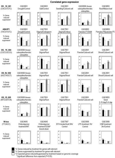 Regulatory fingerprints of cis-acting regulatory elements (CREs). Rice genes bearing predicted or known CREs were scored as either two-fold induced, two-fold suppressed, or neutral by pair-wise comparison of gene expression under two test conditions indicated above each bar chart. As a test of CRE function, the population of genes with the CRE was considered responsive to the test conditions if a significantly (*; p < 0.05) greater number of genes were induced (black bars) or suppressed (grey bars) than that expected by chance (white bars). SAM, shoot apical meristem; P1, panicles at 0–3 cm; P5, panicles at 15–22 cm; P6, panicles at 22–30 cm; dap, days after pollination; BTH, benzothiadiazole; GN8, N-acetylchitooligosaccharide; and LPS, lipopolysaccharides.