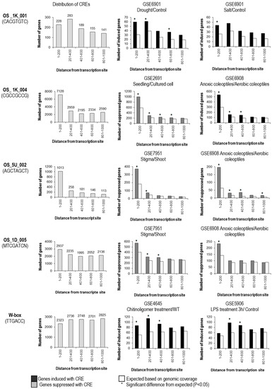 Most predicted CREs were found to be enriched within the 0.2-kb upstream sequences from TSS (such as OS_1K_004 and OS_5U_002). OS_1K_001 has the highest distribution at 201–400 bp upstream, while in contrast, OS_1D_005 and W-box were quite evenly distributed in the 1-kb upstream sequence from TSS (Figure 2). The distance of CREs from the TSS was demonstrated to affect the biological significance (association of the presence of the CRE with differential regulation) of some CREs. OS_1K_004 and OS_5U_002 were found to be biologically significant when located between 1 and 800 bp upstream of TSS; whereas OS_1K_001, OS_1D_005 and W-box were found to be effective at 1–600 bp upstream of TSS (Figure 2). Predicted CREs with significant correlation to gene expression were from the 1-kb upstream sequence from TSS; however, a few CREs that were predicted from the 5′-UTRs and 1-kb downstream of the TSC were also found to be biologically significant at the 1-kb upstream sequence, notably OS _5U_005 (NMTCGATC) and OS_5U_002 (AGCTAGCT) (Figure 2). Relatively, very few CREs with significant correlation were found in the introns. Since OS_5U_005 shares high sequence identities to OS_1D_005 (MTCGATCN), which was predicted in the 1-kb downstream sequence, only the positional effect of the latter was analyzed (Figure 2).