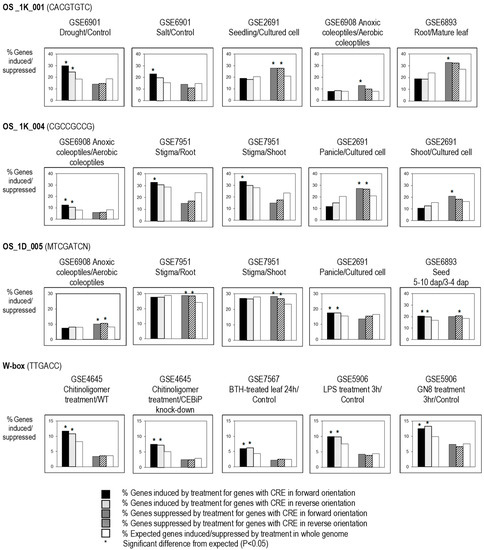 The algorithm that was originally used by Geisler et al. [18] for the identification and testing CREs and their potential regulatory roles from the co-expressed genes of A. thaliana was examined to evaluate whether the algorithm works equally efficient and reliably for the rice genomic and expression data by using previously known experimentally determined CREs. The PATMATCH application [21] was used to generate a list of patterns matching sequences from the rice genome that contain a particular CRE at 1 kb upstream of the annotated transcription start (TSS). The genomic distribution of known CREs from rice was correlated with rice expression data from multiple DNA microarrays covering various experimental conditions. In our terminology hereafter, a predicted CRE is considered if: 1. The frequency of occurrence in the 1 kb upstream was significantly higher than expected based on random nucleotide model in a forward approach; and 2. The genes with the putative CRE in the 1 kb upstream are significantly more induced or suppressed compared with all the genes in the genome using a chi-squared test (p < 0.05) in a reverse approach. A rice gene expression meta-database consisting of 231 relative gene expression (log2 [ratio]) values of multiple genes under different conditions or treatments (Supplementary Table S1) was assembled and computed for this purpose. A chi-squared test then determined the likelihood (p-value) that the observed enrichment of differential regulation of genes with the CRE was likely due to chance. The pattern of differential expression enrichment across multiple experiments associated with a predicted or known CRE in their 1-kb upstream region is potentially diagnostic of the regulatory function of that CRE and the trans-acting factors associating with it. Thus, the enrichment pattern is similar to a fingerprint of regulation, and is hereafter referred to as the regulatory fingerprint of the CRE. This provided experimental evidence for the biological functionality, the type of regulation (induction or suppression), and the signal pathways (by treatment) eliciting a response for a CRE in planta. In this test, we assume that a gene bearing a true CRE should be significantly more upregulated or downregulated under one or more specific treatments compared to the average of the whole genome (Figure 1).