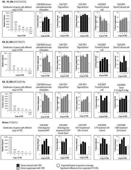 In a related study, we examined the influence of multiple copies of the same predicted CRE in the same promoter region. Our analysis showed that the predicted CREs examined occur naturally in 1–2 copies in most 1-kb upstream gene sequences bearing them; however, they were also found in multiple copies in 1-kb upstream gene sequences of a small number of genes (Figure 4). OS_1K_004 and OS_5U_002 were found to be biologically significant from 1–3 copies (Figure 4), while W box and OS_1D_005 were only biologically significant in 1–2 copies. Thus, the probability of an effect seems not to be much affected by copy number; however, the magnitude of effect (the fold change of the affected genes) may be affected, and should be further studied, but was beyond the scope of this study.