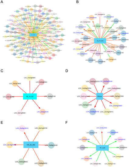 Selected CREs and their associated TFs. (A) The significantly associated TFs with OS_1K_004; (B–F), the associated TFs (R ≥ |0.45|) with OS_1K_004, OS_1K_001, W-box, OS_5U_002, and RY_motif, respectively. The rectangular shape represents the CRE with its name labeled; circles, the associated TFs with the CRE with the gene name labeled; color of circles, different classes of TFs; red line, positive correlation; green line, negative correlation; thickness of line, the degree of correlation (in proportion to the thickness); arrow head and blue labeling, gene with the CRE in its 1-kb upstream sequence from the transcription start site.