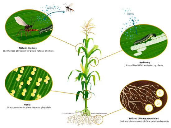 As part of their defense mechanisms, plants emit HIPVs that serves as cues for natural enemies to locate insect pests. The role of Si on the emission of HIPVs could improve the ability of pest’s natural enemies to locate their prey or hosts. Given the few studies conducted so far and the gigantic number of possibilities for plant specific interactions with pests and natural enemies, silicon impact on tritrophic relationship should be tested for different plant models. When evaluating the volatile organic compounds (VOCs) emission of one plant, one should also compare the impact of various types of insect herbivory. Plants can communicate on vertical channels between below- and aboveground plant-feeding insects. Aboveground herbivores impact the development and growth of plant’s feeders but also the attractiveness of the parasitoid of leaf feeders. The underlying mechanism mediating this effect is based on changes in the volatile blend of the plant [102]. It would be useful to study the combined effect of a root pest and silicon on the attractiveness of the plant to parasitoids. It remains to clarify how silicon changes a plant volatilome, and what organisms are impacted, whether they belong to the second, third or fourth trophic level of the food chain.