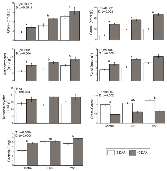All microbial group abundances (Figure 1) were significantly affected by treatment and duration, with the exception of microeukaryotes abundance, which was only affected by duration. Gram+, Gram−, actinomycetes, and fungi values were significantly higher in the C50 and C25 treatments relative to the control. Values of the C25 treatment were significantly lower than those recorded in C50. Additionally, most microbial variables showed increased values in 40DAA compared to those in 15DAA. Regarding the bacteria/fungi and Gram-/Gram+ ratios, the C50 samples had significantly higher values than the control samples, while the 15DAA samples were lower compared to 40DAA for the bacteria/fungi and higher in the Gram−/Gram+ ratio.