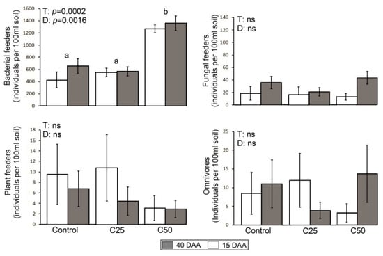 Mean values (± st. error) of variables for nematode trophic group abundances and results of PERMANOVA associated with “treatment” (T) and “duration of treatment” (D) on these parameters. Different letters (a, b) indicate significant differences of pairwise comparisons among treatments (Control, C25 and C50). The results of principal component analysis (PCA), depicting the ordination of samples and variables are presented in Figure 4. The first axis explained 54.4% of the data variability, while the second one explained 17.5% (71.9% in total). Samples of the C50 for both durations were ordinated at the left part of the first axis showing a positive correlation mostly to Gram−, Gram+, fungi, and bacterial-feeding nematodes. The samples of control and C25 of 15DAA were placed at the right side of the first axis showing a positive correlation to plant-feeding nematodes. Samples of 15DAA were separated along the second axis from all other samples and were ordinated in the lower part, showing a positive correlation to urease, dehydrogenase and alkaline phosphatase activities.